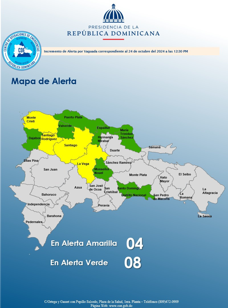 Hasta el momento se conoce que un total de cuatro provincias, Monte Cristi, Santiago Rodríguez, Santiago y La Vega, se encuentran en alerta amarilla, mientras que Dajabón, Puerto Plata, Valverde, Espaillat, María Trinidad Sánchez, Monseñor Nouel y el Gran Santo Domingo están en alerta verde.