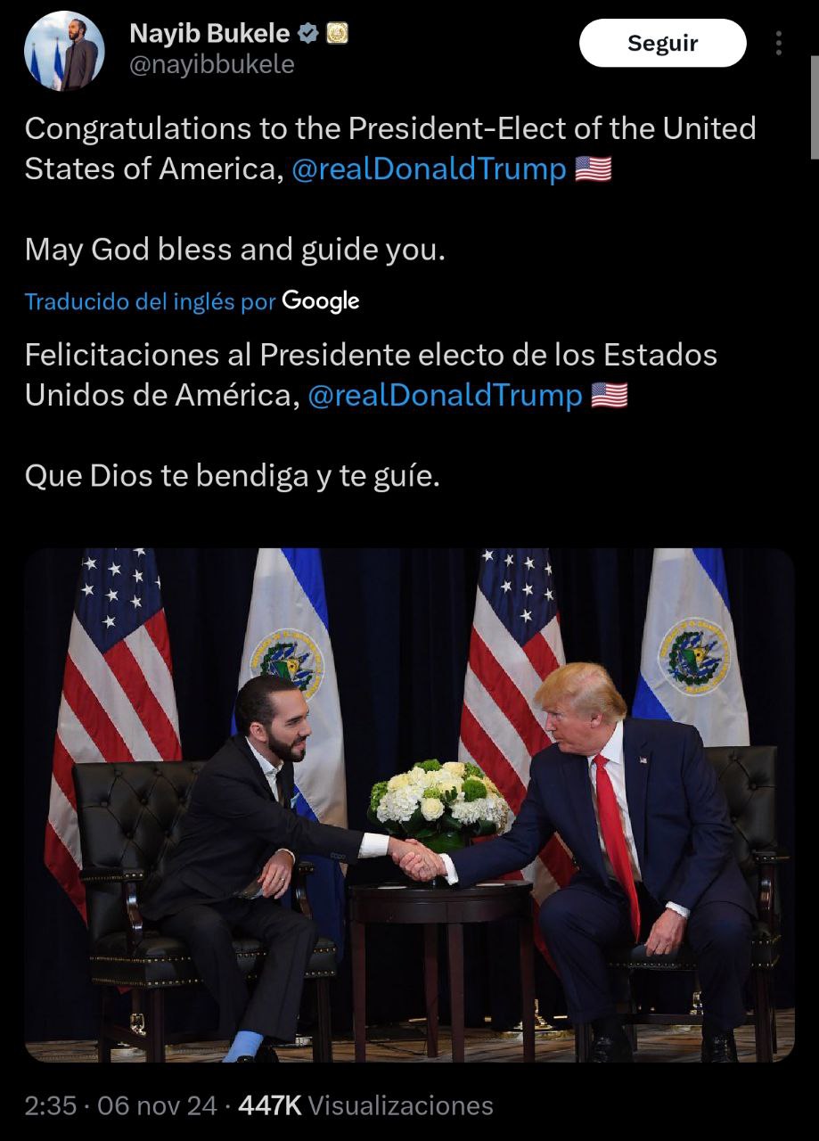 El presidente de El Salvador, Nayib Bukele, fue el primer jefe de Estado en felicitar a Trump por su victoria electoral. «Felicidades al Presidente Donald Trump por su reelección», tuiteó Bukele.