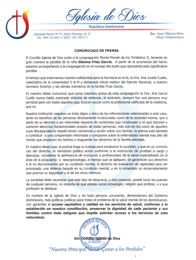«El Concilio Iglesia de Dios, junto a la congregación Monte Moriah de los Trinitarios II, lamenta en gran manera la perdida de la niña Elianna Frías García. A partir de la ocurrencia del hecho estamos acompañando a la congregación en el manejo del duelo que representa esta significativa perdida.